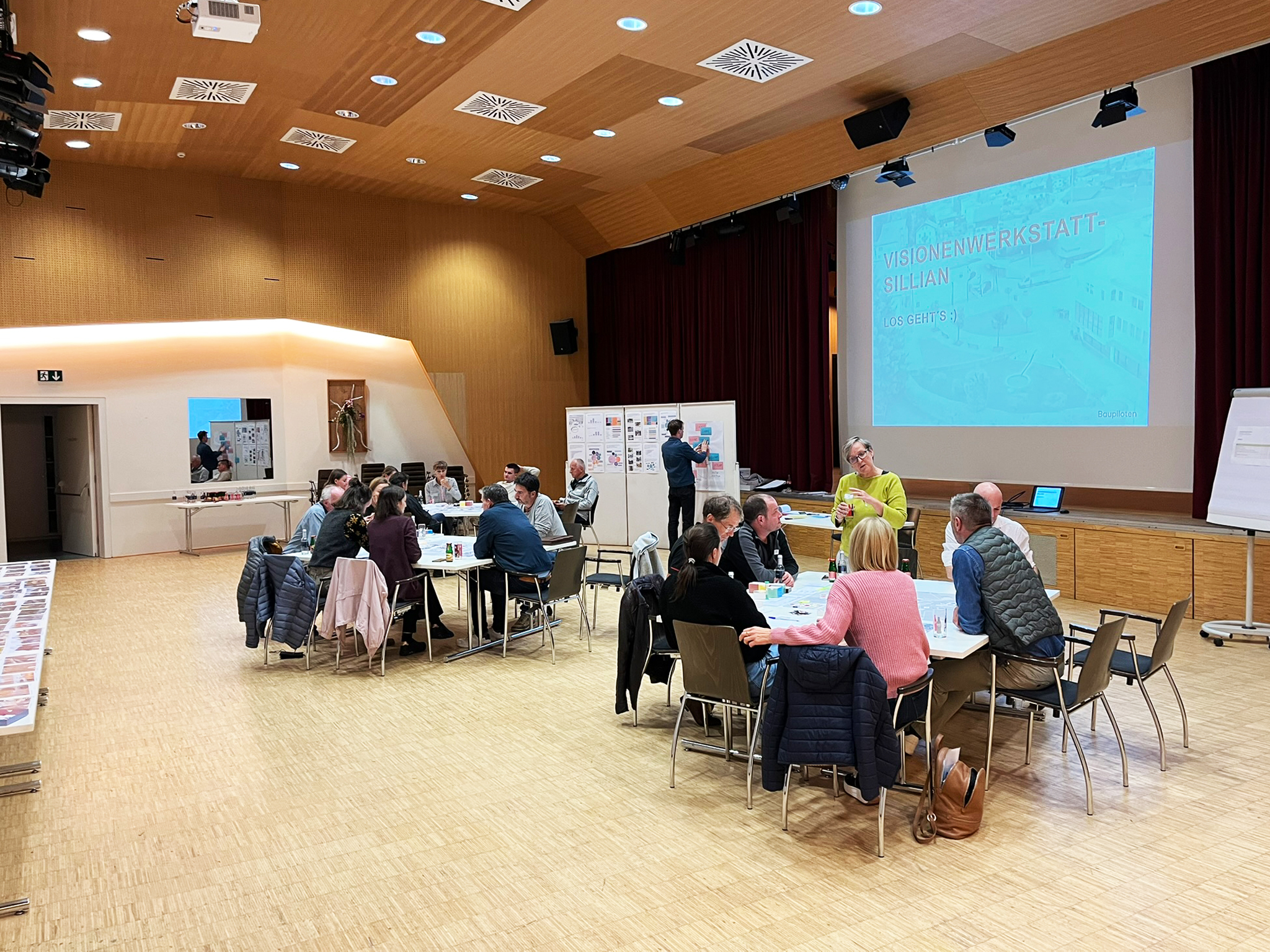 Am 2. Oktober fand die Visionswerkstatt für den Vorplatz des Gemeinde- und Kulturhauses in Sillian statt – gemeinsam mit Vertreter*innen des Gemeinderates, der Vereine, den Anrainer*innen und engagierten Bürger*innen. Im Mittelpunkt stand das Thema Wasser, das seit jeher für Leben, Bewegung und Gemeinschaft steht. Die Grundlage für die Entscheidungen in der Visionenwerkstatt bildeten die Ergebnisse der Bürger*innenbefragung. Die Ergebnisse der Bürger*innenbefragung sind in der Gemeinde ausgestellt und hier online sichtbar.