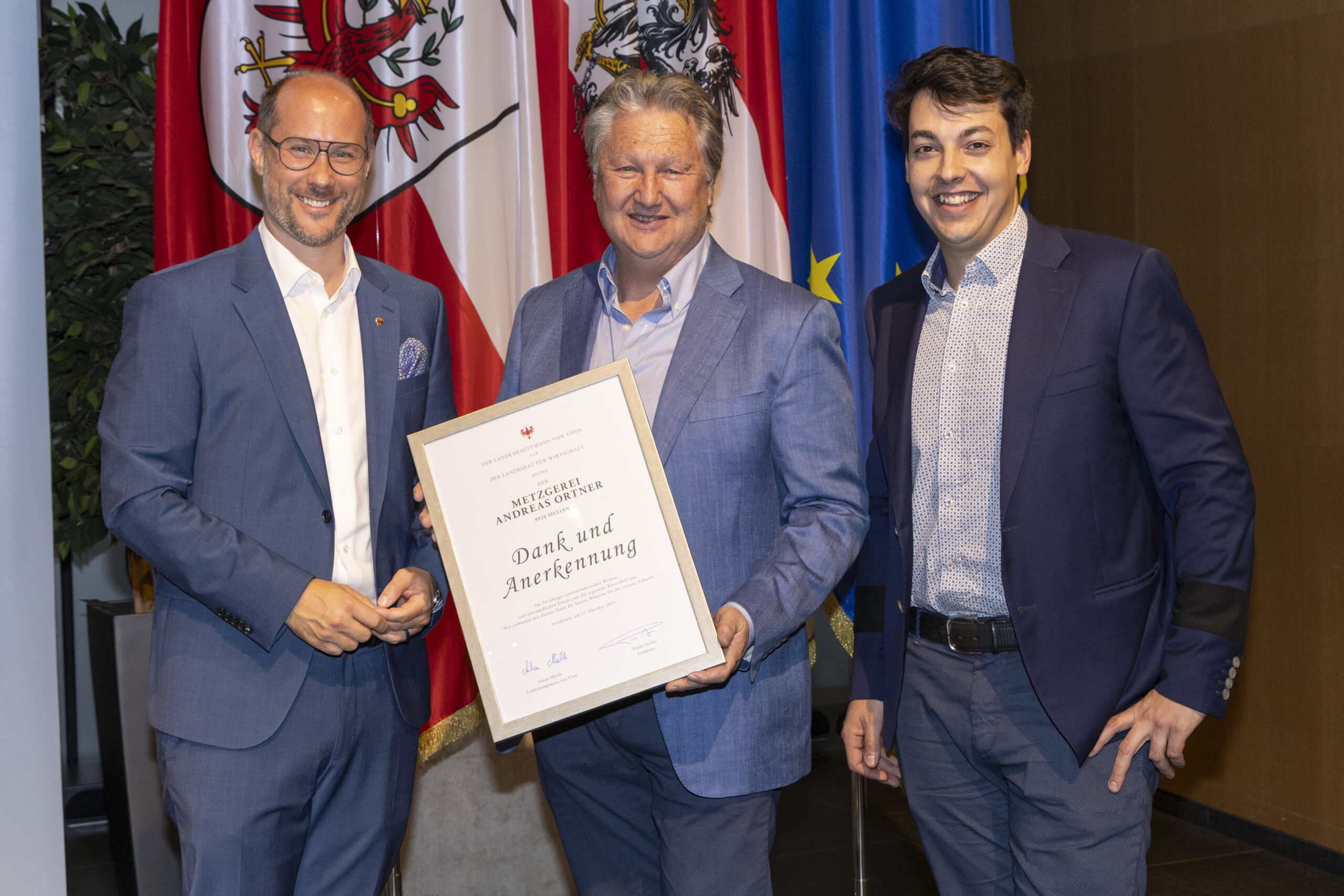 Anerkennung des Landes Tirol für Verdienste um die heimische Wirtschaft – Fleischwaren Ortner GmbH & Co. KG als Tiroler Traditionsbetrieb ausgezeichnet